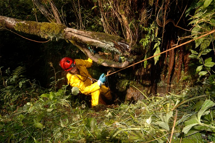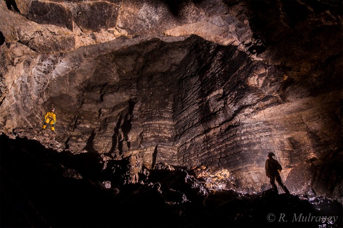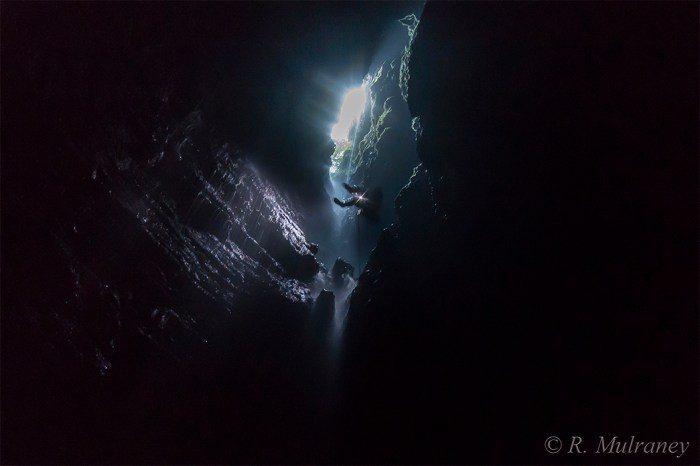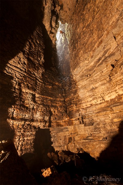Dropping the pitch of approximately 40m from the boggy surface is an intimidating though awe-inspiring experience. As one descends on the rope the vertical shaft, with its own mini-waterfall, suddenly bells out, opening into a massive chamber littered with huge boulders at the bottom.