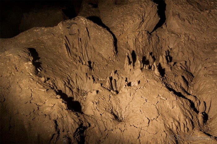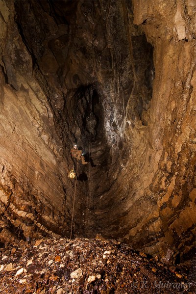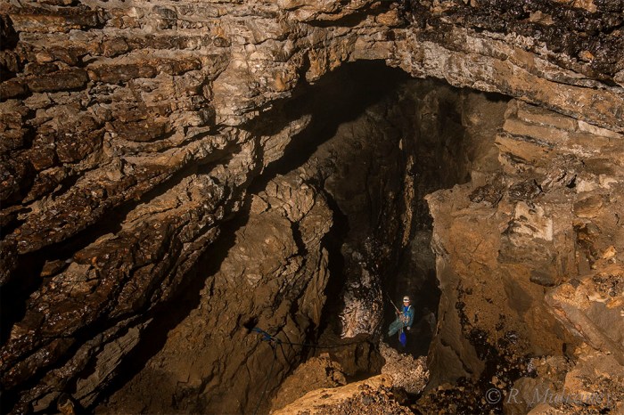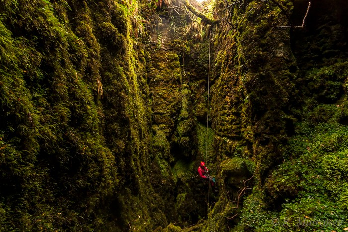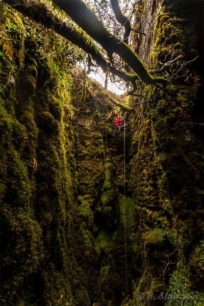 The cave itself starts with a beautiful 25m daylight pitch down the moss-covered walls of the narrow rift and is proceeded by four further pitches. The middle three are very fine shafts although the huge amount of loose chert scree makes access difficult and somewhat dangerous. Near the bottom, a purer limestone prevails and there are short developed passageways which become extremely muddy.