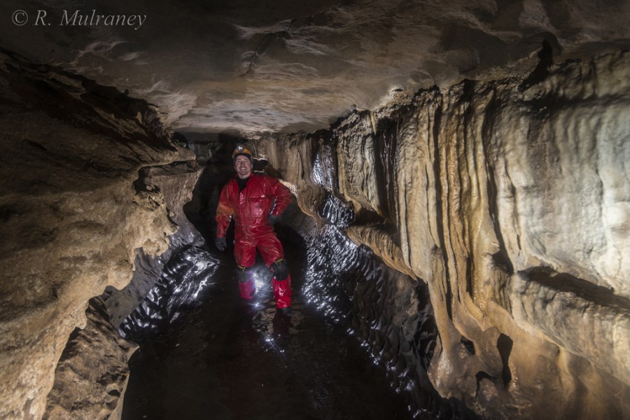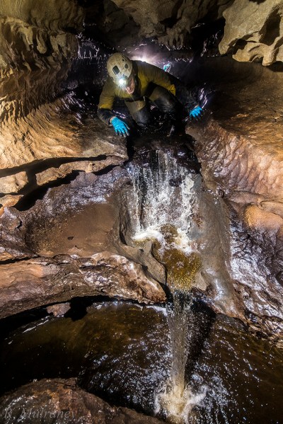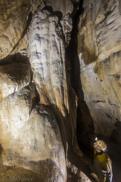However, in sporting trips to the cave this is not immediately obvious as one walks for kilometres through seemingly endless meandering passages with fine scalloped walls of exceptionally clean and well bedded limestone. There are some fine features to notice, outside of the occasional well decorated passage or grotto, such as the small waterfalls created where the stream makes contact with a chert bed which, not being soluble like limestone, breaks at a sharp dip, causing the water to cascade. There are also many ‘mushrooms’, where a rounded ‘cap’ of undissolved chert protects the limestone ‘stem’ on which it is seated, giving a mushroom shape. The cave also features some impressive high avens and the 35m deep Poulelva Pothole, an entrance into the cave from the surface.