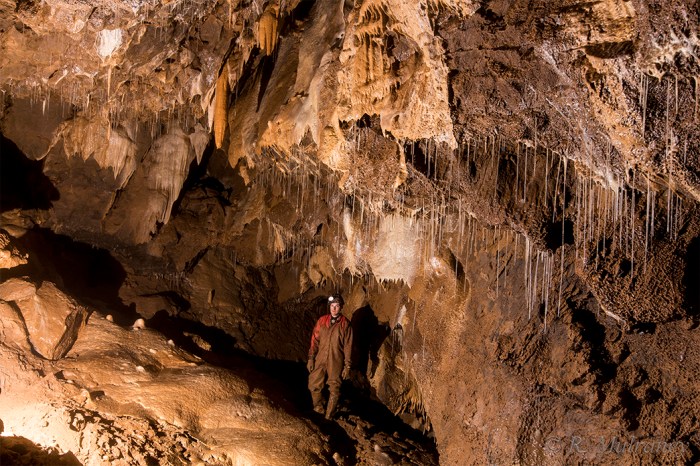 There is a feeling of isolation yet haughtiness from this beautiful chamber. Being here feels like you have been satisfied and could happily return home, but the cave keeps on giving. Just beyond, the Egg Chamber is very finely decorated with calcite straws and stals. If this were not enough, a slight crawl opens up into the ‘Castle Gardens’ chamber. There is almost too much for the senses here – a large chamber with pristine cracked-mud formations (so called the ‘Giant’s Causeway’), a high roof with a boulder collapse; while the walls are plastered in fine formations.