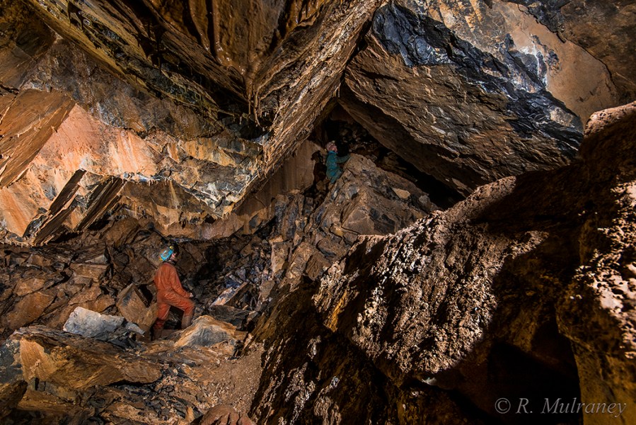 This large chamber consists of the distinctive angled walls found almost entirely throughout this cave, as well as in Old Desmond. A chamber off the south-side, while smaller, is just as impressive for the remarkable blue colouration of its limestone. I was worried taking the photo, below, that the blue tint of the rock would not be obvious in the photo. However, it came out well and is accurately represented.