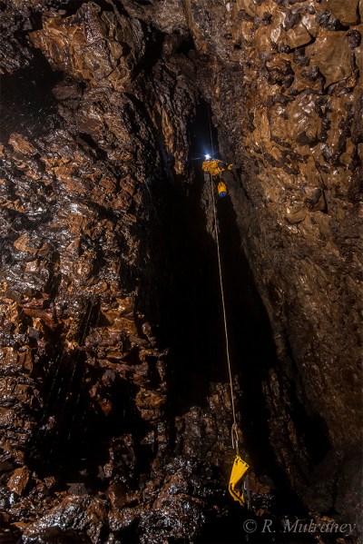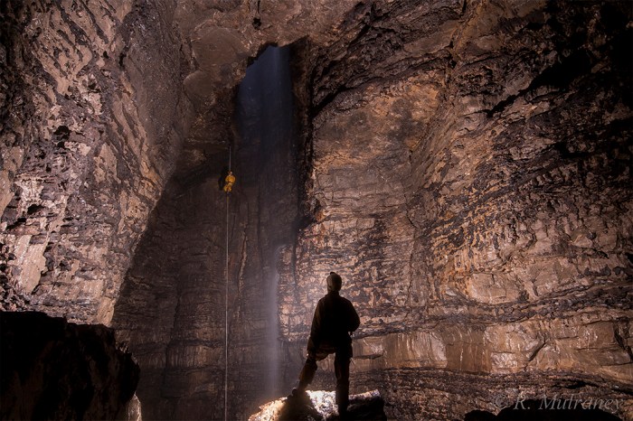 The difficulties that the cave photographer faces in most caves are greater than ever here. Taking photos of people on rope can introduce shake into the picture and restricts where artificial lighting can be placed. Some of the massive chambers are not easily lit, even when they have open daylight entrances, and they require extreme lighting power.