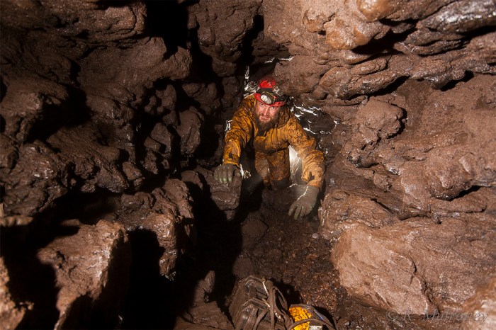 When the tight space finally opens up into the main chamber of ‘Tagha, it is a sight to behold. It is a massive room 60 meters long and 40 meters wide and is crowned by a dramatic waterfall enetering 60 meters above the cavers’ heads. The waterfall, which sinks at Pollinksa adjacent to Tagha, comes crashing down to the cave floor hitting numerous ledges and sending spray around the chamber. This view must surely be one of the most spectacular sights in Ireland and is certainly one of my favourite underground spots.