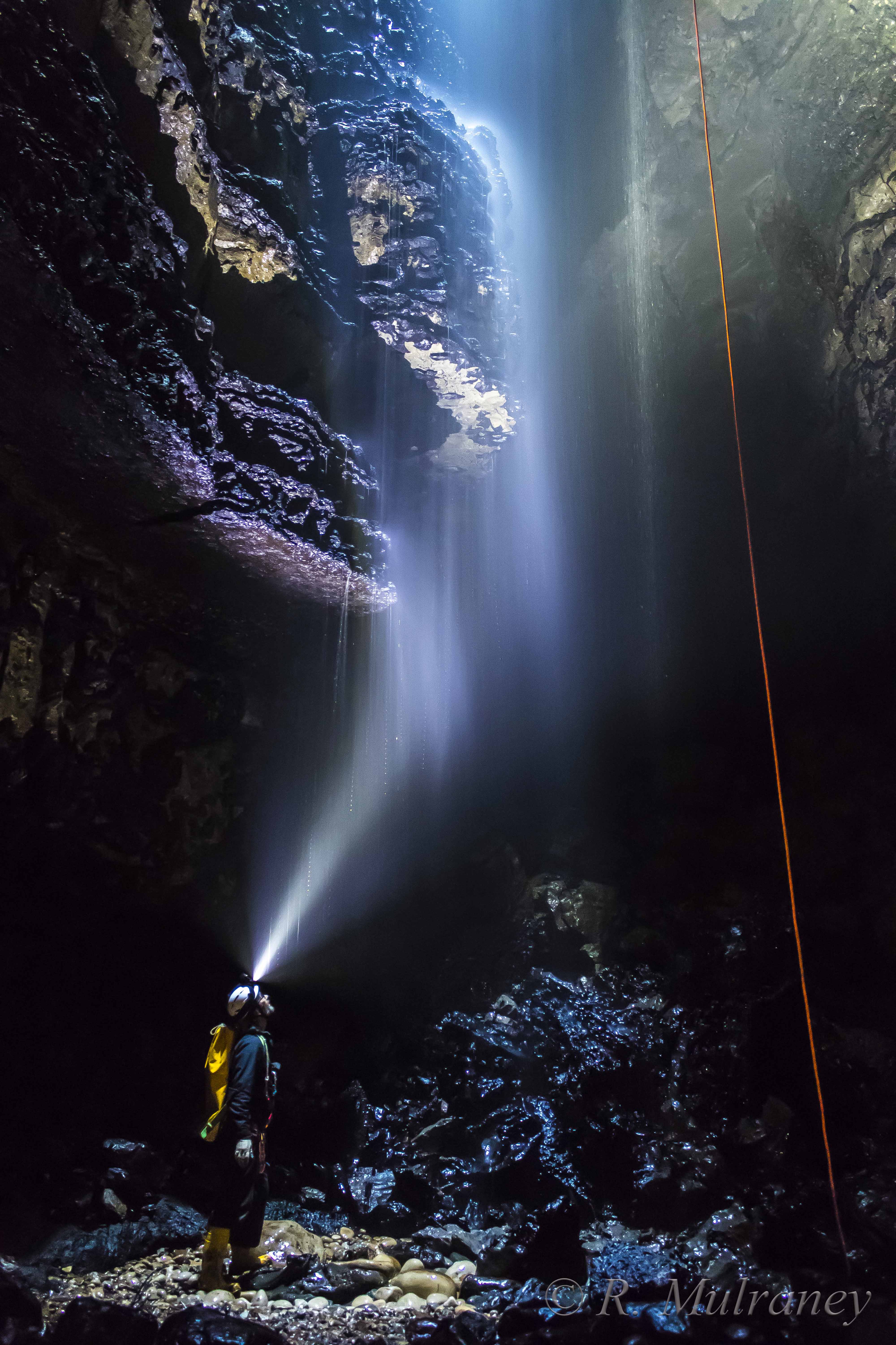 With few exceptions the East Cuilcagh caves are deep vertical chasms, many of which begin as small pots and open into dramatic and massive chambers. These are places of large open spaces, crashing waterfalls, loose chert-bands and grim limestone, and few cave decorations.
